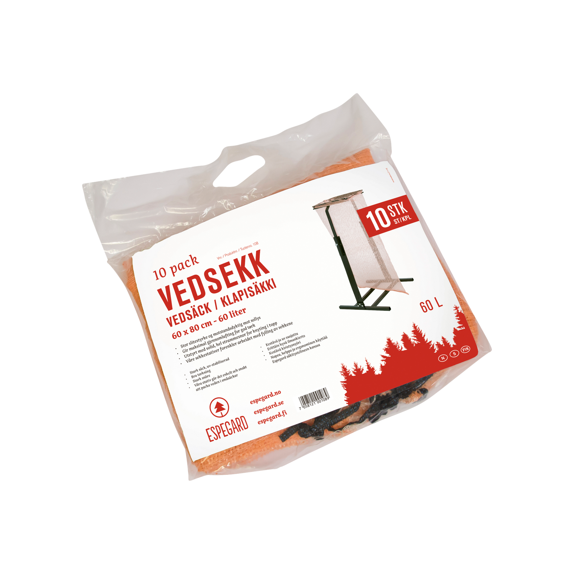 Förpackning med 10 st högkvalitativa, UV-stabiliserade 60L-säckar, för engångsbruk. Med snörning. Ved i 60-liters säckar är ett billigt sätt att emballera på och som förenklar hantering och transport. Veden torkar bra och dess kvalitet syns tydligt genom nätet. Säckarna testas och kontrolleras före försäljning. För att förenkla packningen av ved finns det olika stativ som är anpassade för 60 säckar.