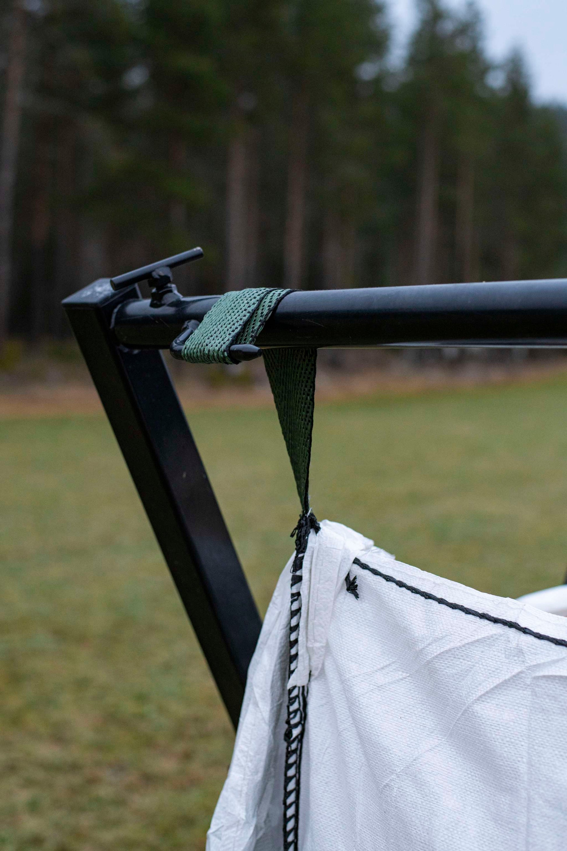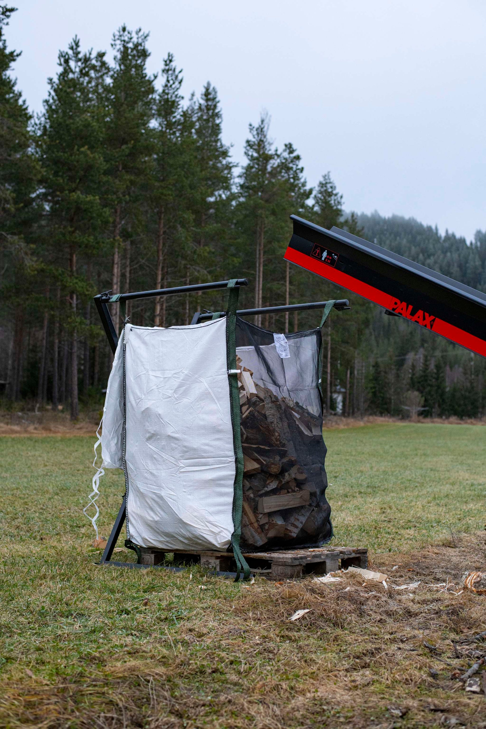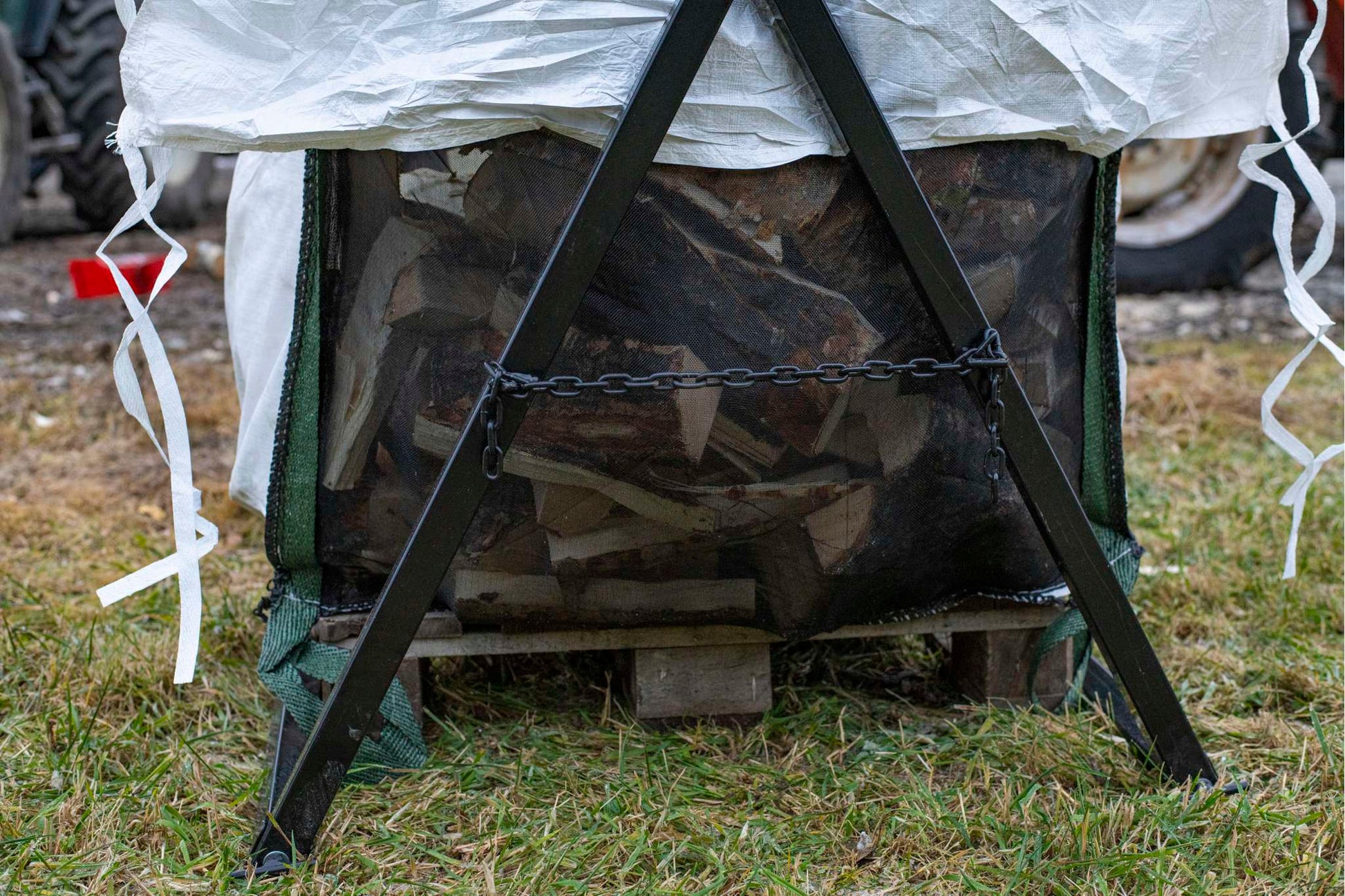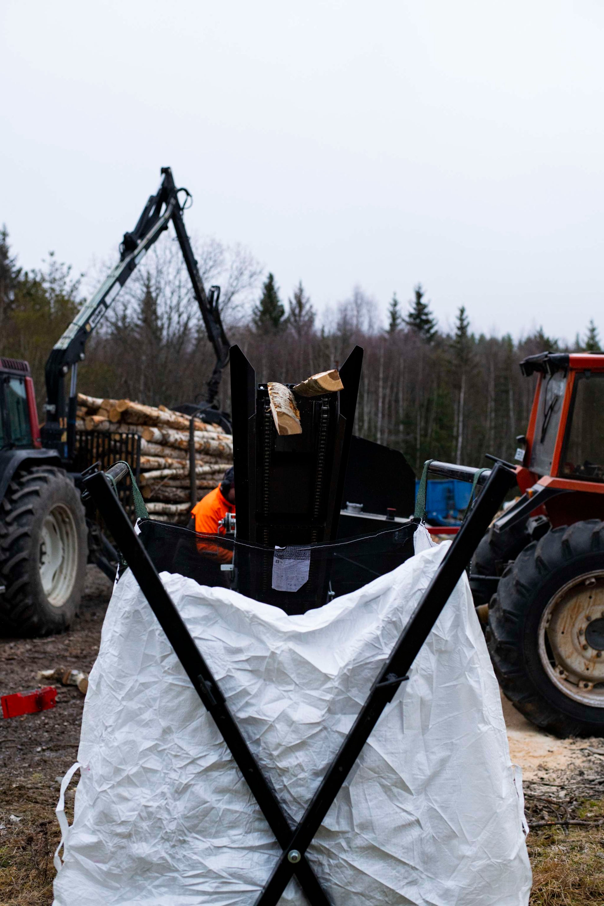 Stativ för storsäckar i lackerat stål, med nkel montering. Stativet är justerbart i höjd och bredd, och är ihopfällbar för praktisk förvaring. Smart lösning för att fästa och lossa lyftöglorna på säcken.